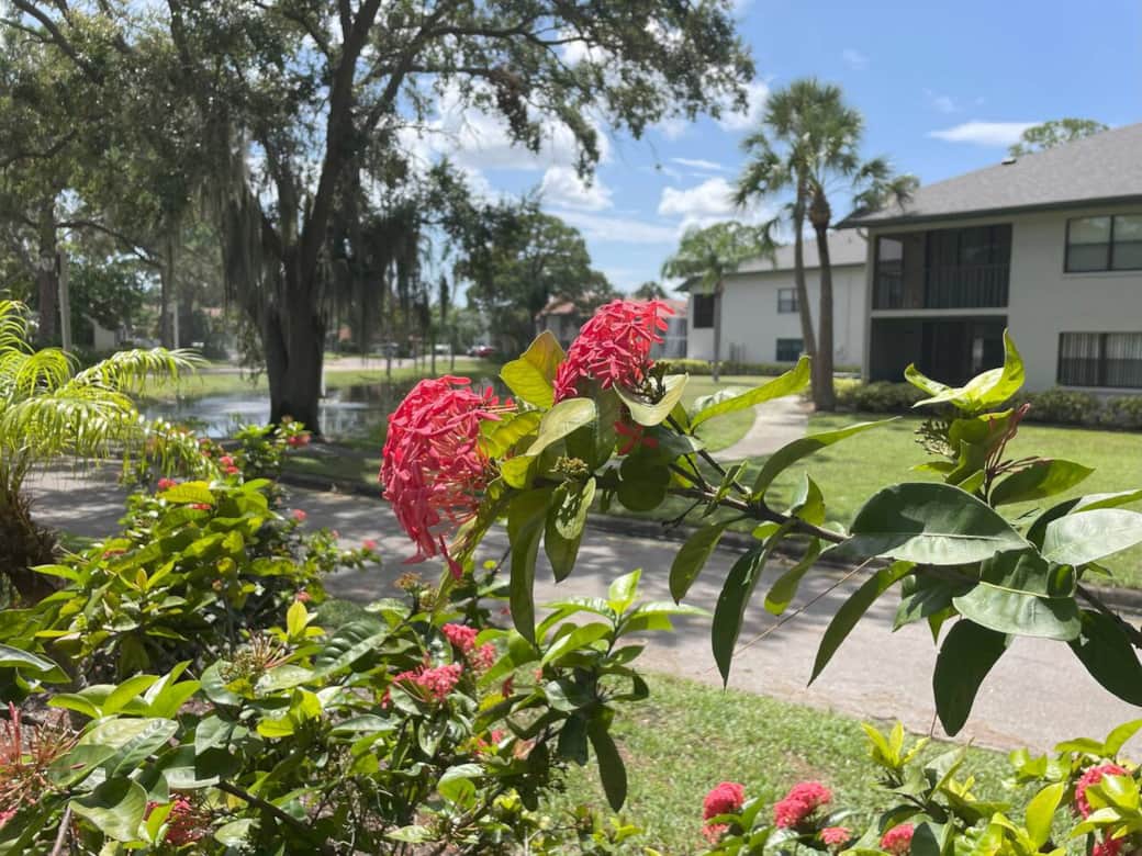 🌴 Lush tropical landscaping with palms & exotic flowers